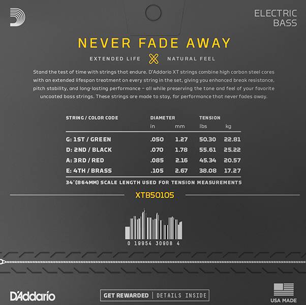 D'ADDARIO XTB50105 XT Комплект струн для бас-гитары, никелированные, 50-105, с покрытием