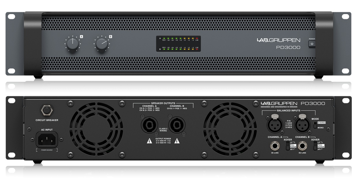 Lab.gruppen PD3000 усилитель 2-канальный. Мощность (на канал): 1000Вт•2Ω, 1500Вт•4Ω, 800Вт•8Ω, кроссовер 100 Гц